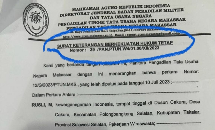 Read MorePemerintah Kabupaten (Pemkab) Takalar akhirnya mematuhi putusan Pengadilan Tinggi Tata Usaha Negara (PT TUN) Makassar mengenai gugatan hasil Pilkades di