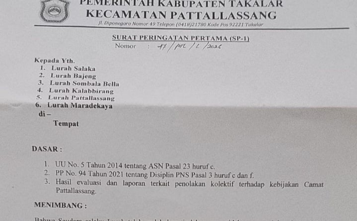 TAKALAR – Surat Peringatan (SP) I yang dikeluarkan Camat Pattallassang, Kabupaten Takalar, mendadak jadi perbincangan. Surat tersebut bahkan ramai beredar