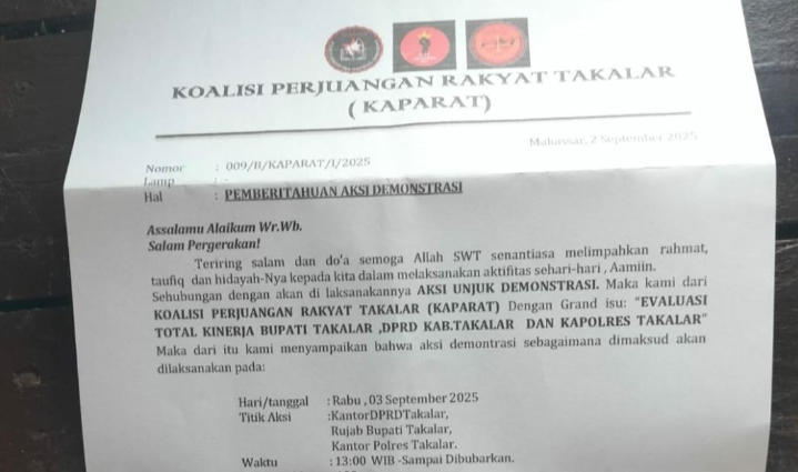 Read MoreTAKALAR – Koalisi Perjuangan Rakyat Takalar (KAPARAT) akan menggelar aksi unjuk rasa hari ini, Rabu, 3 September 2025. Aksi tersebut