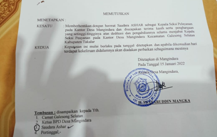 Hingga informasi ini dimediakan, Kades maupun Camat setempat belum berhasil dimintai konfirmasinya. Namun putusan pemberhentian salah satu perangkat desa merupakan bukti awal perlakuan yang mengabaikan edaran Bupati. (rd)