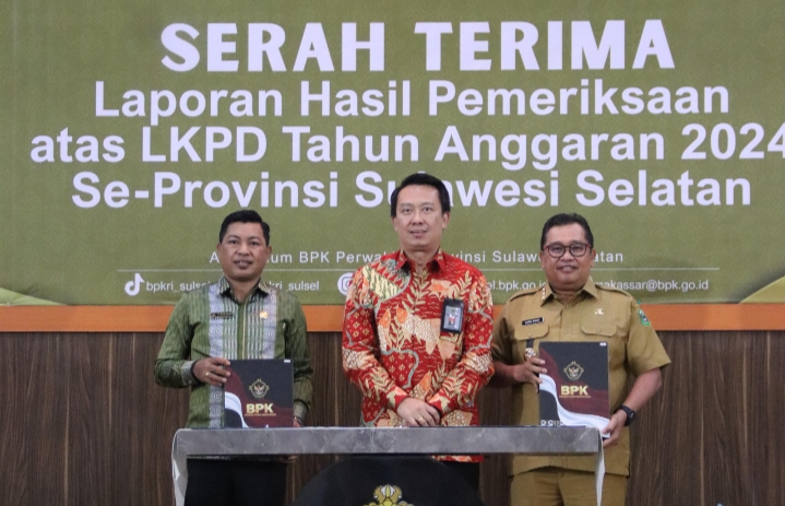 Penyerahan laporan hasil pemeriksaan atas Laporan Keuangan Pemerintah Daerah (LKPD) se-Sulawesi Selatan berlangsung di Auditorium BPK RI Perwakilan Sulsel, Jalan AP Pettarani, Selasa 27 Mei 2025.