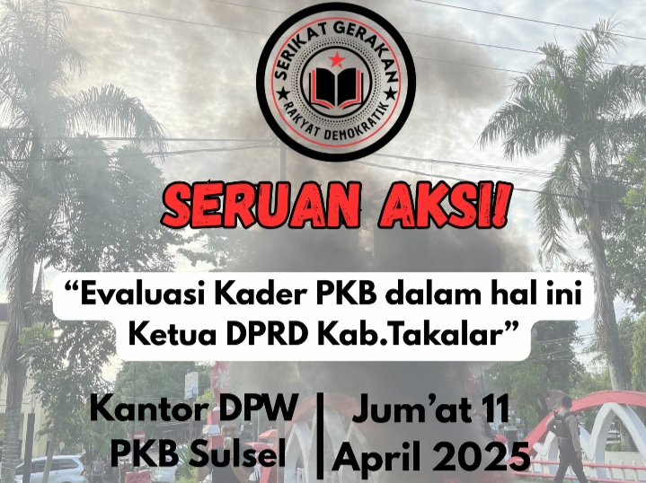 “Serikat Gerakan Rakyat Demokratik” inilah lembaga yang akan menggelar aksi hari ini di Makassar dengan agenda evaluasi kader PKB dalam hal ini Ketua DPRD Kabupaten Takalar.