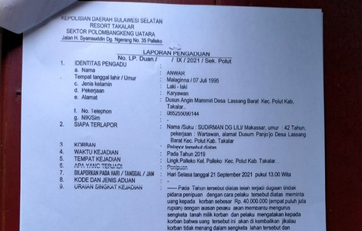 TAKALAR – Bermula dari niat SL membantu menguruskan sengketa tanah agar bisa menang di Pengadilan, akhirnya berbalik menjadi terlapor. Pasalnya, SL dilaporkan telah melakukan penipuan oleh Anwar selaku korban. “Benar, saya sudah melapor di Polsek Polut atas dugaan penipuan yang dilakukan SL terhadap saya,” aku Anwar ke wartawan.