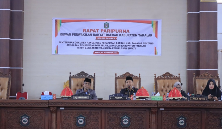 TAKALAR – Penyerahan Rancangan Peraturan Daerah tentang Anggaran Pendapatan dan Belanja Daerah TA. 2024 oleh Pj. Bupati Takalar Dr. Setiawan Aswad, M. Dev. Plg ke Wakil Ketua DPRD Hj. Erni Halera melalui sidang Paripurna DPRD Takalar di Ruang Rapat Lt. II DPRD Takalar, Kamis, 9 November 2023.